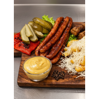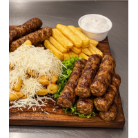 Conține : 2 buc de cârnați trandafir, cartofi prăjiți , muștar