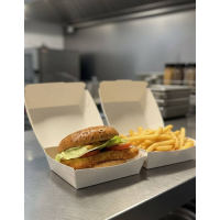 Chiflă de burger , piept de pui în crustă crocantă, roșii, salată verde, cașcaval, sos che... Detalii