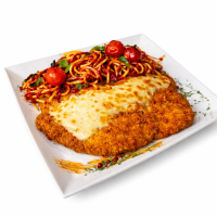 Șnițel cu mozzarella și roșii cherry cu cartofi pai