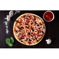 (sos pizza, oregano, mozzarella, bacon, cârnaţi, şuncă, salam, măsline, ciuperci)