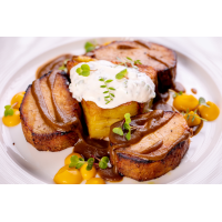 piure de cartofi, usturoi confiat, ceapa arsa, sos porto cu tarhon si smantana (10,12)