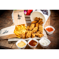 Fâșii din piept de pui în crustă crocantă, cartofi prăjiți, 4 sosuri la alegere 900/720/30... Detalii