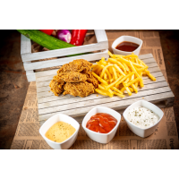 fâșii din piept de pui în crustă crocantă 180 g, cartofi prăjiți 150 g, sos la alegere 75... Detalii