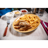 Fâșii din piept de pui în crustă crocantă, cartofi prăjiți, 1 sos la alegere 180/150/75 g