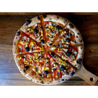 -blat pizza, sos pomodoro, mozzarella, ciuperci, roșii, ardei, ceapă, porumb,măsline