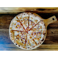 Blat pizza, sos de usturoi,mozzarella fior di latte,carne de pui, ceapă roșie