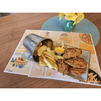 șnițel cu fulgi de porumb, , castraveți murați , salată , roșii , ceapă, sos hamburger, br... Detalii