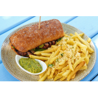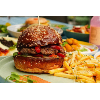 Chiflă burger 70 g, chiftea carne de vită 180 g, cartofi prăjiți 130 g, sos calypso 50 g,... Detalii