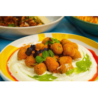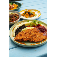 Piept de pui 200 g, cartofi prăjiți 130 g, ouă 50 g, sos aioli, făină albă, fulgi de porum... Detalii