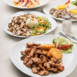 Snitel parizian, Aripioare bbq, Crispy, piept de pui la gratar,cartofi prajiti si 2 salate... Detalii