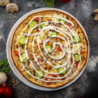 blat pizza, sos gyros, mozzarella, ciuperci, roșii, ceapă roșie, castraveți, sos de usturo... Detalii
