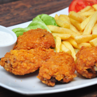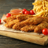 piept de pui sau aripi de pui crispy, cartofi prăjiți, 1 sos la alegere, băutură răcoritoa... Detalii