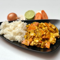 orez jasmine, piept de pui, ardei tricolor, ceapă, sos curry gold