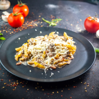 paste, piept de pui 80 g, sos de roșii 70 g, sos alb (contine lapte) 70 g, ceapă 20 g, bra... Detalii