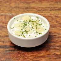 cartofi pai 170 g, piept de pui 80 g, mozzarella 50 g, sos de usturoi, ceapă prâjită,