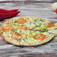 blat pizza, sos de usturoi, mozzarella, filata, piept de pui, porumb, măsline negre pizza... Detalii