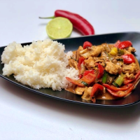 orez jasmine, piept de pui, ardei tricolor, ceapă, sos curry gold
