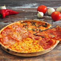 blat pizza, sos pizza, mozzarella, ciuperci, ardei, porumb, ceapă, mazăre verde pizzatés... Detalii