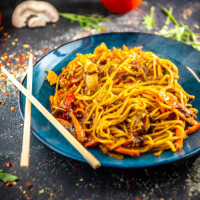 piept de pui, ciuperci, morcovi, ceapă, ardei, roşii, ghimbir, chili, sos soia, paste nood... Detalii