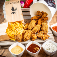 aripi de pui în crustă crocantă 700 g, cartofi prăjiți 300 g , 2 sosuri la alegere