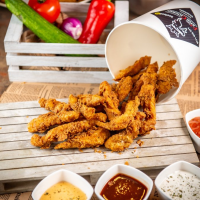 Fâșii din piept de pui în crustă crocantă, cartofi prăjiți, 2 sosuri la alegere 700/300/15... Detalii