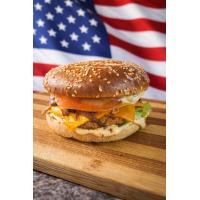 Carne de vită Angus 250gr + Sosul Casei + Sos chilli + Cașcaval cheddar + Salată iceberg + Castraveți + Roșii + Ceapă+ chifla... Detalii