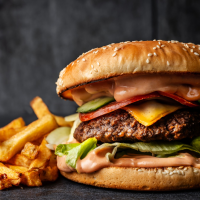 Carne piept de pui + 2x Cascaval Cheddar +Ceapa Caramelizata + Ceapa uscata + Salată Icebe... Detalii