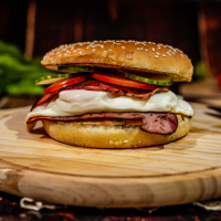 Bacon + Ouă + Cașcaval + Salată Iceberg + Roșii + Castraveți + Sosul casei