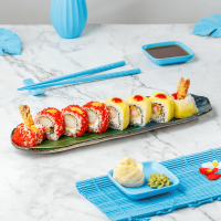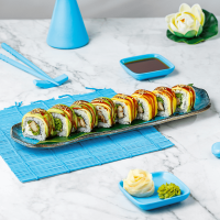 Orez (120g), creveți tempura (produs decongelat) (45g), castravete (20g), cremă de brânză... Detalii
