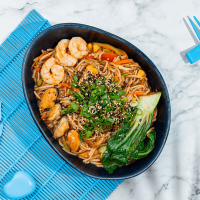 Tăiței udon (200g), creveți (produs decongelat) (48g), sos de stridii (50g), sos de soia... Detalii