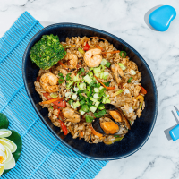 Orez (200g), creveți (produs decongelat) (22g), midii (22g), ardei (20g), morcov (12g), ce... Detalii
