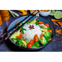 Orez Jasmine, legume proaspete, usturoi și sos de soia. | Jasmine rice, fresh vegetables,... Detalii