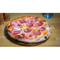 Blat pizza 250 g, Sos rosii 30 g ,Mozzarella 200 g , Bacon 40 g , Salam 40 g , Sunca , 40... Detalii
